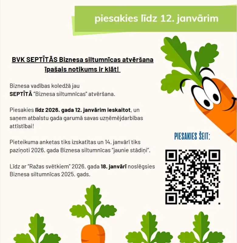 Aicinām visu BVK studiju programmu studentus pieteikties virtuālajam biznesa inkubatoram “Biznesa siltumnīca”, līdz 12.01.2026. aizpildot pietiekuma anketu šeit: estudijas.bvk.lv/estudijas/7/