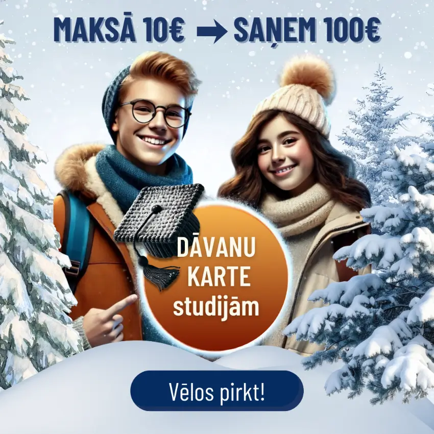 - Dāvanu karte izmantojama, noslēdzot studiju līgumu Biznesa vadības koledžas Ziemas uzņemšanas ietvaros (periodā no 10.10.2025. - 20.03.2026.) un uzsākot studijas 2026. gada pavasara semestrī.
