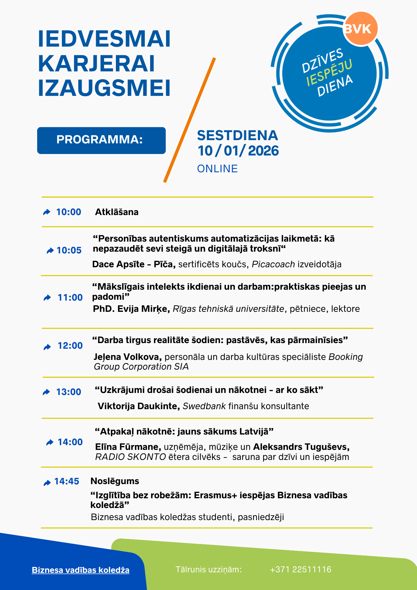 Šogad programmā tēmas par mākslīgā intelekta praktisku pielietojumu, finanšu pratību un gudrām investīcijām,personības autentiskumu digitālajā laikmetā, par atgriešanosun karjeras veidošanu Latvijā pēc ilgāka ārzemēs pavadīta laika. Ielūkosimies arī mūsdienu darba tirgus tendencēs un izaicinājumos, kā uzņēmumi pielāgojas paaudžu nomaiņai un darbinieku mainībai. Iepazīstināsim ar Biznesa vadības koledžas tālmācības studiju programmām un vērtīgo Erasmus+ pieredzi – iespējām, ko sniedz mūsdienīga izglītība bez robežām.